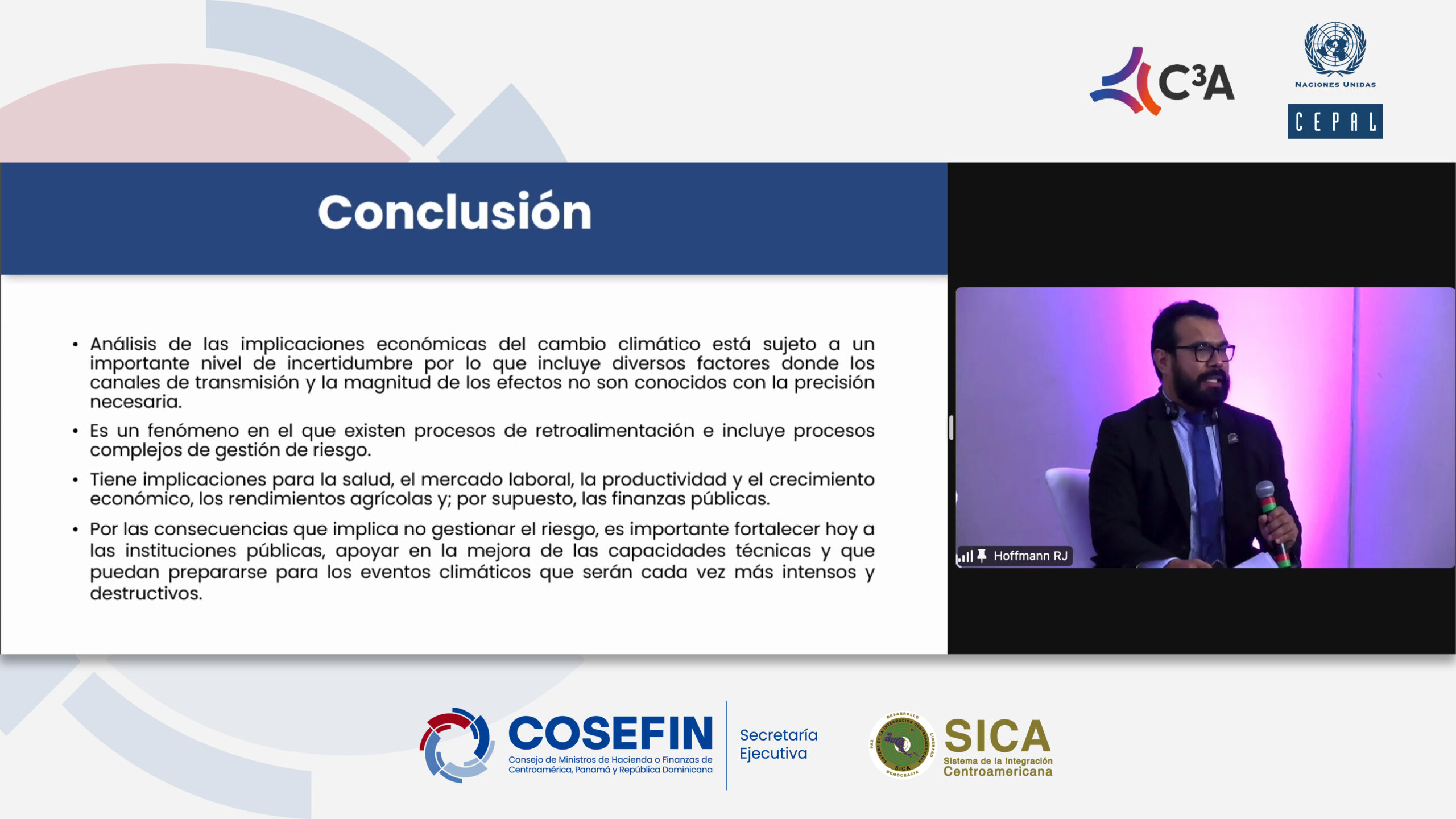 Al terminar la sesión, se resaltó la necesidad de sinergias entre los sectores público y privado para minimizar las pérdidas económicas debidas al cambio climático, la inclusión del desarrollo tecnológico y la mejora del capital humano, así como la inversión directa en adaptación climática y la creación de marcos normativos que promuevan comportamientos adaptativos.
