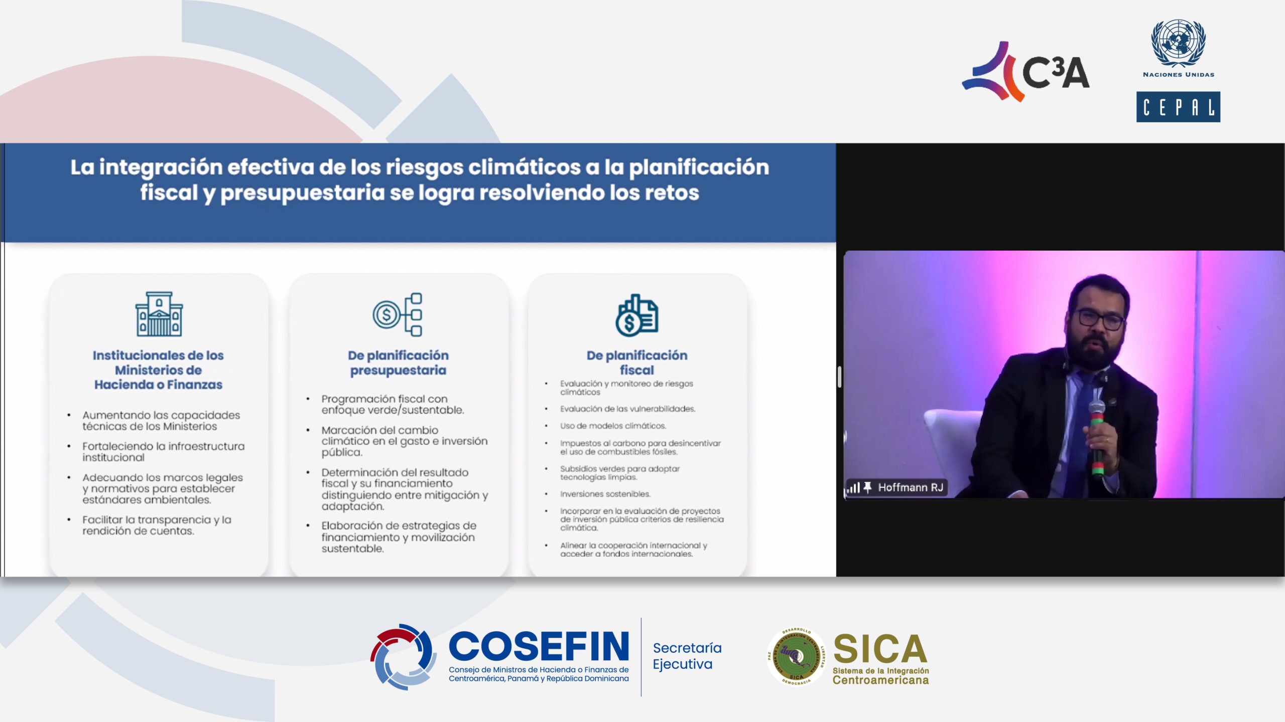 La sexta sesión, moderada por José Eduardo Alatorre de la CEPAL, se enfocó en la necesidad de que los Ministerios de Finanzas integren herramientas analíticas en sus procesos de toma de decisiones para evaluar y gestionar los riesgos climáticos. Los objetivos principales fueron identificar los retos de políticas a cuantificar mediante modelos económicos, discutir la sostenibilidad fiscal en un contexto de cambio climático y destacar cómo las nuevas herramientas pueden ayudar a incluir los riesgos climáticos en los análisis y decisiones de política económica.