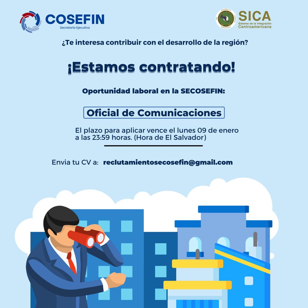 La Secretaría Ejecutiva del COSEFIN está buscando un/a Oficial de Comunicaciones para dar apoyo al Secretario Ejecutivo en materia de comunicación y diseño gráfico en temas estratégicos que la SECOSEFIN mantiene con los Ministerios de Hacienda o Finanzas, institucionalidad del Sistema de Integración Centroamericana (SICA), y socios estratégicos de la Cooperación Internacional.