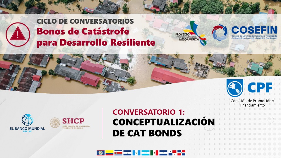 En el marco del plan de actividades 2022 de la Comisión de Promoción y Financiamiento (CPF) y mediante la coordinación regional con el Dr. Alfredo Flores Sarria, Secretario Ejecutivo del Consejo de Ministros de Hacienda o Finanzas de Centroamérica, Panamá y República Dominicana (SE-COSEFIN), se desarrolló la primera sesión del Ciclo de Conversatorios sobre Bonos de Catástrofes para Desarrollo Resiliente (Cat-Bonds), con el objetivo de promover la gestión del conocimiento sobre acceso a estos bonos y así fortalecer las capacidades de los Coordinadores Nacionales de la CPF de los 10 países miembros del Proyecto de Integración y Desarrollo de Mesoamérica (PM).