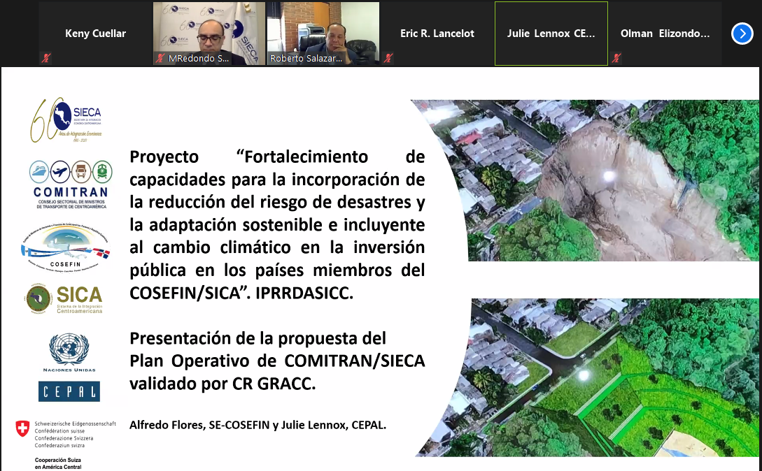 El 19 de mayo de 2021, durante la XLVII Reunión Ordinaria del Consejo Sectorial de Ministros de Transporte de Centroamérica (COMITRAN), los seis ministros miembros del COMITRAN aprobaron el Plan Operativo de SIECA/COMITRAN en el marco del proyecto “Fortalecimiento de Capacidades para la Incorporación del Riesgo de Desastres y la Adaptación Sostenible e Incluyente al Cambio Climático en la Inversión Pública en los países miembros del COSEFIN/SICA” (IPRRDASICC). El Secretario Ejecutivo del COSEFIN, licenciado Alfredo Flores, habló sobre los mecanismos de cogestión y contribuciones entre socios que se están llevando a cabo para la implementación de dicho proyecto cuyo objetivo es reducir la pérdida y daños causados por desastres mediante la inclusión de la reducción de riesgo en los proyectos de inversión pública dentro de los países de la región centroamericana y de República Dominicana.